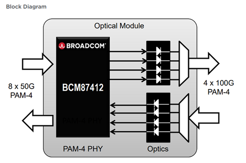 在2022年3月份舉辦的OFC展會期間,博通(Broadcom)展示了其基于112G PAM4 DSP平臺的新產(chǎn)品BCM87412,該產(chǎn)品號稱具有最高水平的CMOS集成度,優(yōu)越的性能和較低的功耗,并集成了TIA與高擺幅激光驅(qū)動器,支持實現(xiàn)低于7W功耗的400GDR4/FR4模塊,相比業(yè)內(nèi)普通的9W功耗產(chǎn)品,博通的這一新產(chǎn)品提供了業(yè)界最低的pJ/bit性能,支持超級數(shù)據(jù)中心和云計算服務商的功耗降到前所未有的程度。